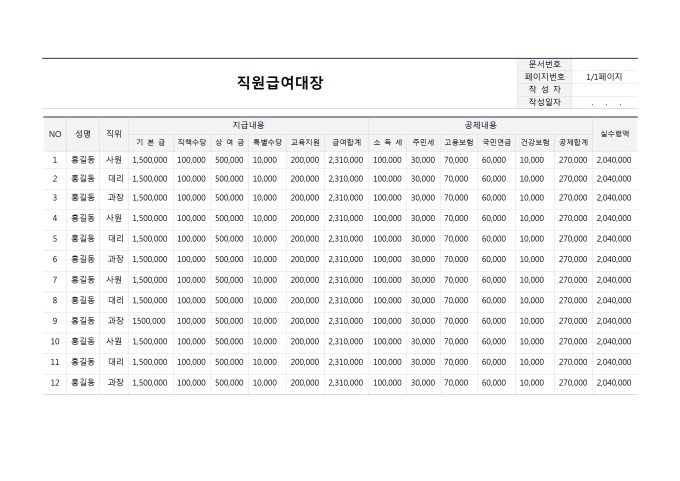 급여대장, 급여명세서 통합관리 서식