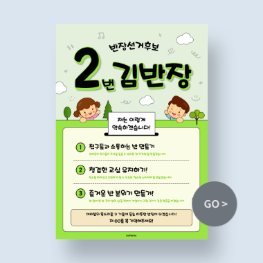 저학년의 경우 너무 복잡한 디자인보다는 "직관적으로" 한눈에 보이는 것이 중요합니다. 공약은 3가지 이하로 간단명료하게 정리하여 정중앙에 배치하면 친구들이 기억하기 쉽습니다.