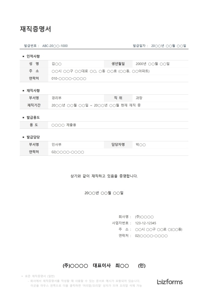 표준 재직증명서 (일반)